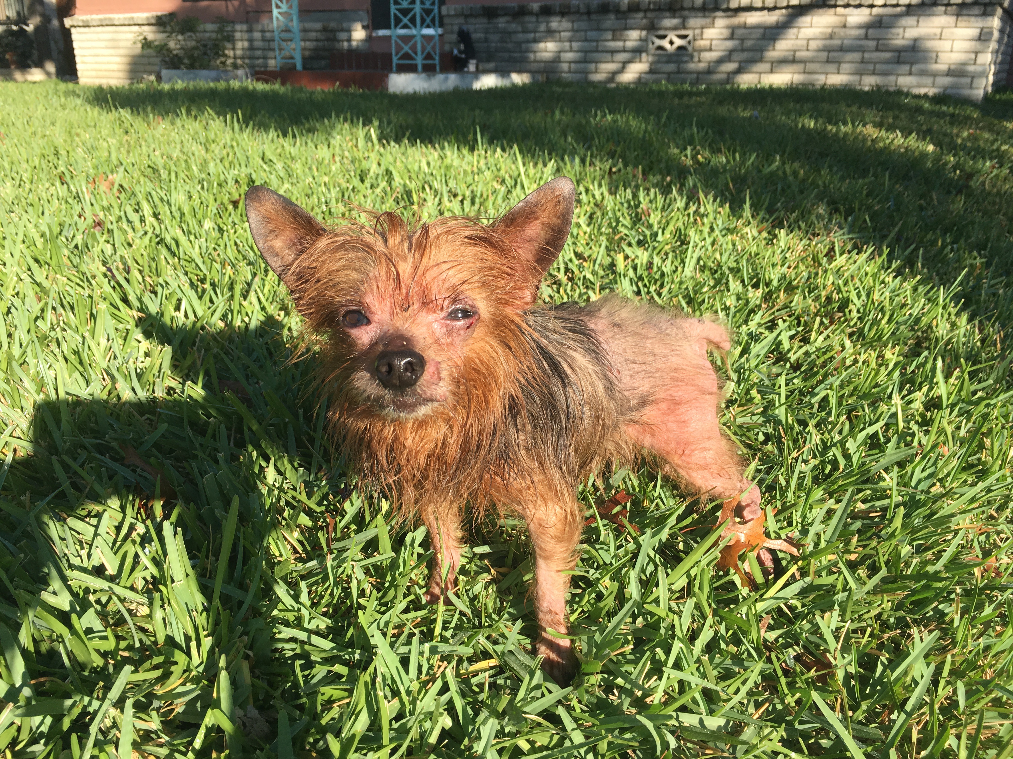 I picked up this tiny, pitiful creature last week. He was wandering around, crawling with fleas and covered in scabs, fur all gone from the shoulders down, and hungry. Now his name is Mankey and he’s getting food and soft place to sleep and a medicated bath every other day. And, he’s happy!